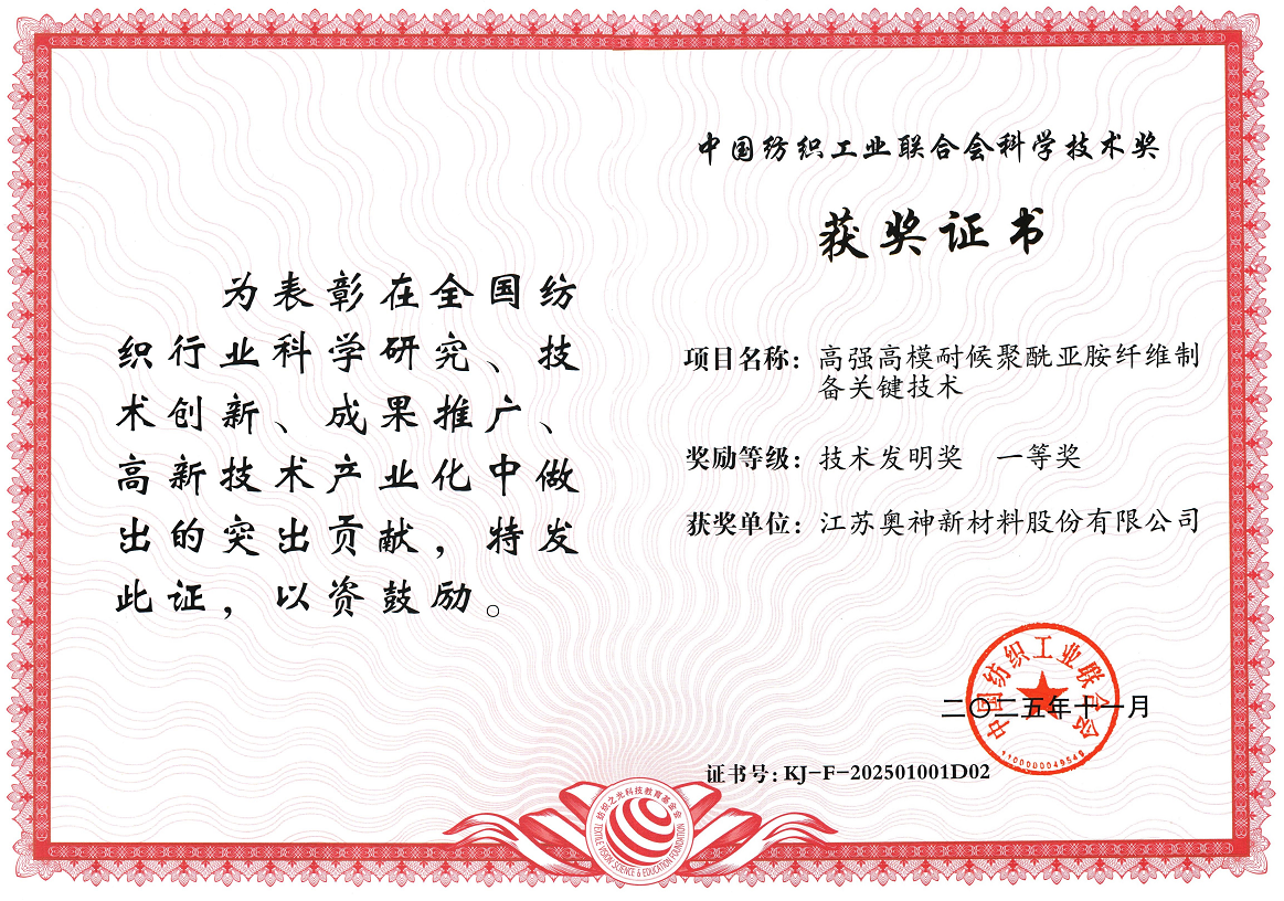 奧神新材高強高模耐候聚酰亞胺纖維制備關鍵技術榮獲中紡聯技術發明一等獎